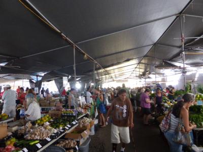 Der Farmers Market in Hilo. Die Atmosphäre ist dort nicht sehr amerikanisch, alles wirkt eher asiatisch. Hier haben wir uns gestern mit Obst und Gemüse eingedeckt. Aber auch hier hat die Inflation zugeschlagen. Heute bekommt man für 1 USD nur noch 5 Papayas, vor 2 Jahren waren es noch 6.