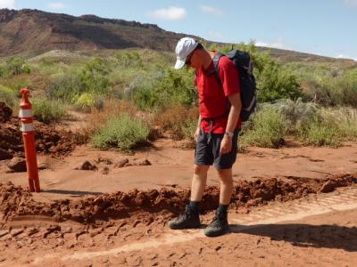 Nachdem wir Dienstag früh befürchtet hatten, den Tag Indoor verbringen zu müssen, waren wir positiv überrascht, als die Wolkendecke aufgerissen ist und die Sonne durchgelassen hat. Da wir nicht sicher waren, ob das so bleibt, haben wir uns ein kleines Erstbesucher-Programm im Arches National Park vorgenommen, bei dem man sich nicht zu weit vom Auto entfernt. Wir haben Arches besucht, bei denen wir seit 1993 nicht mehr waren (sie stehen alle noch). Allerdings schieben sich über diese kurzen Wege richtige Menschenmassen. Daher haben wir uns gefreut zu hören, dass die Zufahrtstrasse zum Parkplatz für den Delicate Arch (das Wahrzeichen Utahs) wegen Überflutung gesperrt war. Dieser Arch ist ein absolutes Highlight und Pflichtprogramm und wir waren schon etliche Male dort. Allerdings konnten wir uns die Gelegenheit, mit nur einer Handvoll Besucher vor Ort zu sein, nicht entgehen lassen. Wir sind also Mittwoch früh von der Hauptstrasse zum Delicate Arch aufgebrochen und konnten zumindest eine kurze Zeit dort mit wenigen Menschen die Ruhe und Aussicht genießen. Nur der Bagger war leider so schnell, dass die Strasse mittags wieder geöffnet wurde: die Ruhe war dahin ....