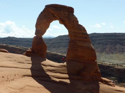 Der Delicate Arch. Das Besondere ist, dass der Arch freistehend ist. Vorne ist ein Kessel und hinter dem Arch geht es steil nach unten. Am Besten ist ein Besuch zum Sonnenuntergang. Dann strahlt die Sonne den Arch von vorne an, sodass die rote Farbe des Gesteins perfekt zur Geltung kommt. So lange wollten wir allerdings dieses Mal nicht warten.