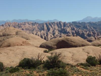 Der Blick von oben auf "Behind the rocks" und die La Sal Mountains