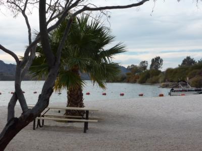 Nachdem wir am Mittwoch Las Vegas verlassen hatten, sind wir Richtung Süden dem Colorado gefolgt und mittlerweile am Lake Havasu angekommen, einem der vielen Stauseen des Colorado. Hier gibt es etliche Campingplätze, an denen richtige kleine Strände für den Sommer angelegt wurden. Auf unserem Campingplatz sind außer uns aktuell nur Rentner, die der Kälte im Norden entflohen sind (Snowbirds). Alle sind völlig entspannt, es ist gemütlich und ruhig. Das einzig Quirlige sind die vielen Vögel und der Welpe unseres Nachbarn.